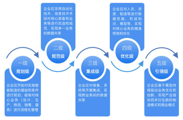 CMMM将企业智能制造水平从低到高分为5个等级,以帮助企业不断提高智能制造能力成熟度,企业和政府可以通过该模型评判企业智能制造发展水平。