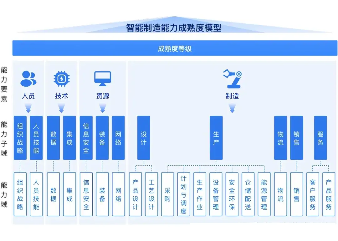 智能制造能力成熟度模型(China Manufacturing Maturity Model,简称CMMM),是由中国电子技术标准化研究院推出的、用于实施智能制造过程改进提升的成熟度评估模型。依据《智能制造能力成熟度模型》(GB/T 39116-2020)和《智能制造能力成熟度评估方法》(GB/T 39117-2020)两项国家标准开展的标准符合性评估,它围绕“智能+制造”两个维度,为企业提供了一个评价其智能制造综合水平的框架,引导企业确立战略目标、采用适宜的方法与路径来实现智能制造。